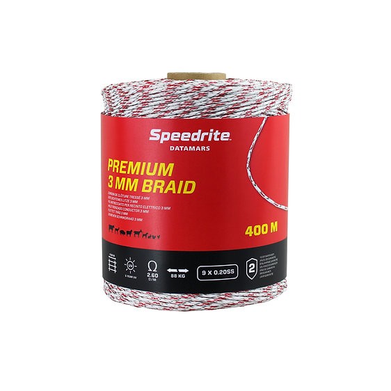 Trenzado Premium de 3 mm Encontrar un distribuidor Características Ideal para cercas temporales de hasta 500 mTrenza resistente y más visible que el cableResistente al estiramiento2 veces más conductor que el hilo conductor estándar Encontrar un distribuidor